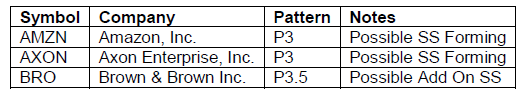 During the week, 100s of charts are sorted through and watched each day. They are grouped based on what it is taking place; some are in the early stages of forming P3 squeezes, and others are forming P3½ patterns. I try to list them ahead of a Sweet Spot confirmation buy signal. Remember that often one pattern leads to the next.